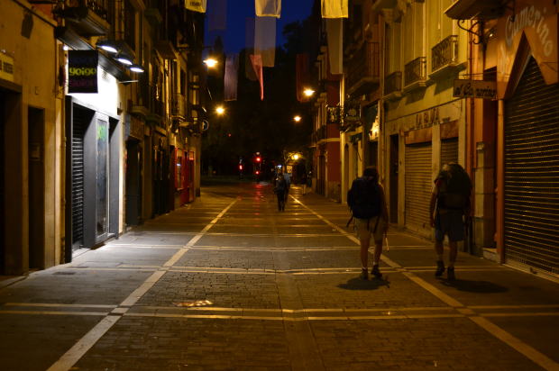 小麦畑は茶色の世界になっていた 【8日目◆12年9月16日(日)◆晴れ◆Pamplona➔Puente la Reina◆23.5km/累計91.7km】 5時半に目が覚める。チェックアウトは7時からなので、出発準備をしてしばし待機。 その間に朝食。といってもパンとチョリソと水だけの簡単なもの。 7時過ぎにホテルを出る。いい宿だったし、いい休日だった。 外はまだ真っ暗。通りを歩いているのは巡礼仲間だけだ。この時間だと半袖はやや寒い。長袖に替えるのも面倒なのでそのまま行くことにする。お日様が出ればあったかくなるだろう。