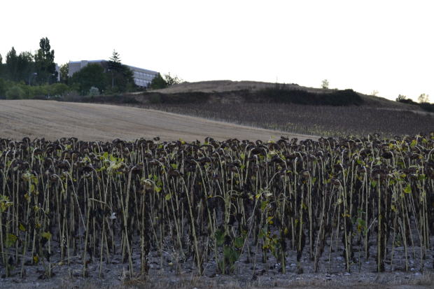 大きな公園の中を通り、川を渡るとナバーラ大学が見える。この大学のオフィスではスタンプをもらえるらしいが、まだ8時前だ。オフィスは開いていないだろう。通過。 このあたりがパンプローナの郊外らしく、宅地に代わって畑地が見えてくる。歩いていると立ち枯れたヒマワリが無残な姿をさらす畑があった。9月の中旬だとこうなってしまうようだ。