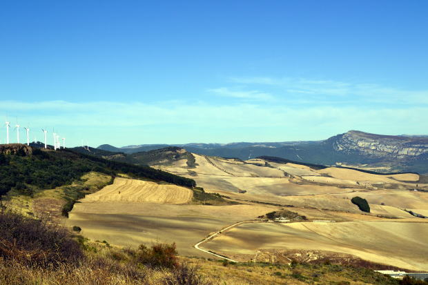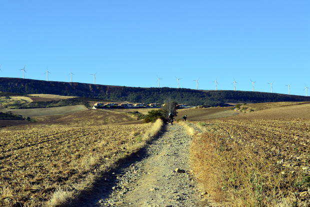 そこを過ぎるとすぐに、稜線に立ち並ぶ風車が目に入ってくる。ガイドブックには、標高780mのペルドン峠に設置された風力発電の風車だと書かれている。