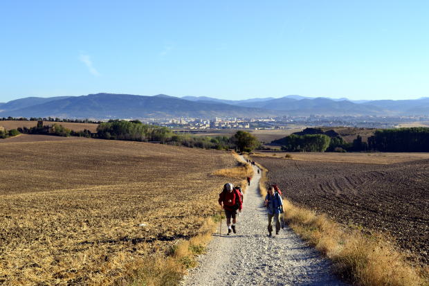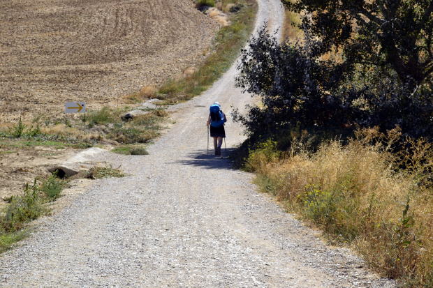 日が昇り、少しずつ気温が上がる。空の青みが増し、くすんだ風景がだんだん輝いてくる。歩いていていちばん気持ちのいい時間だ。 サンティアゴの巡礼路は東から西へと向かうから、お昼ぐらいまでは太陽を背にして歩くことになる。夏だと首筋を焼かれるので、帽子のたれは必需品らしいが、今の季節はそれほどでもない。使わなくても大丈夫だ。 2時間歩いて小休止。あたりは一面、収穫が終わった小麦畑だ。大都会パンプローナから8kmぐらいしか離れていないのに、人家は一軒も見当たらない。どちらを見ても、地肌をむきだしにした畑、畑、畑。その中を白い巡礼路が地平線の果てまで続いている。
