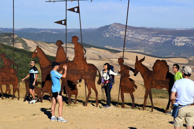 | ▲ペルドン峠の頂きに並ぶ巡礼者のモニュメント。パンプローナから歩くこと3時間で到着。ここからの眺望は最高だ。 |