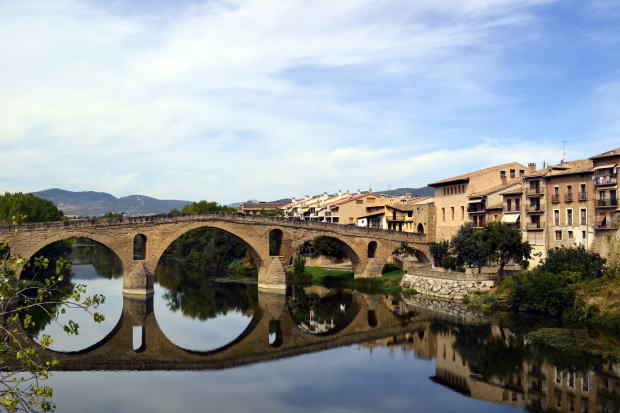 が、これで終わりではない。 まずは公営のアルベルゲでスタンプを押し、ホテルを紹介してもらわなければならない。今日はなんとなくアルベルゲには泊まりたくなかったのだ。 2連泊したホテルが快適だったせいもあるのだが、プライバシーゼロというのは、やはりこたえる。なるべくならホテルでゆっくりしたい。 アルベルゲにするか、ホテルにするか。巡礼旅では、この選択はなかなかやっかいだ。 旅費をおさえるならアルベルゲ。公営なら5ユーロ前後で泊まれる。ガイドブックによれば、無料のアルベルゲもあるとか。私営でも10ユーロぐらいのようだ。 しかし、アルベルゲは集団生活で、規則も厳しく、プライバシーはいっさいないと覚悟する必要がある。 逆なのがホテル(やそれに類するオステル、ペンシオンなど)で、宿泊費は高いが、のんびりくつろげる。 どちらにするかは、ふところ具合と考え方しだいだな。 ここまでの体験でわたしが決めた方針は、半々ぐらいにしようか、というもの。一日おきが理想だが、ホテルがないところはけっこうある。一方、アルベルゲはどこにいってもあるみたいだから、まずホテルをさがし、ダメならアルベルゲ、そんな方針にした。 町の中心のマヨール通りを直進し、アルガ川にかかる王妃の橋を渡る。小さな町だが昔は街道町として栄えたそうで、その面影は残っている。