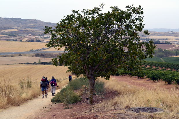 ほんの小さなグラスとはいえ、4年以上も断酒を続けてきた身には効き目がある。胃の腑が熱くなり顔がほてる。忘れていた感覚だ! しかしながら、この心地よさに負けてはならない。それにおぼれたがために、食道がんが発症した(と思う。少なくとも原因のひとつであることは間違いない)。 朝ごはんを食べずにきたのもまずかったかな。50分ほど歩いたところで小休止。パン2切れ、チョリソ3切れ、バナナ1本。 休んでいる間に、巡礼仲間が続々とやってくる。わたしも歩きだそう。9時15分出発。ワインの泉の効果もなくなって、普段どおりの歩きになる。 これまでの風景と違い、このあたりの畑には緑が見える。乾燥した茶色の風景ばかり見てきた目にはとても新鮮に映る。ブドウの木だ。さすがにワインの泉があるだけのことはある。