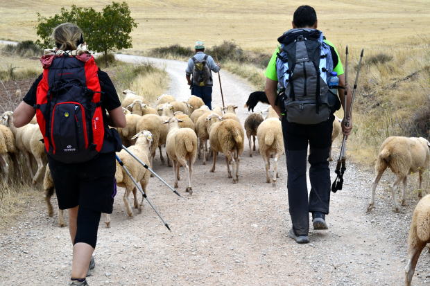 | ▲巡礼路を横切る羊たち。この場合、人は羊たちの歩きを妨げてはならない……らしい。羊が優先。 |