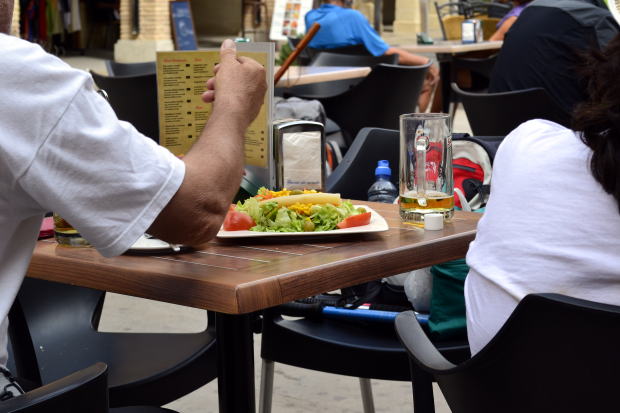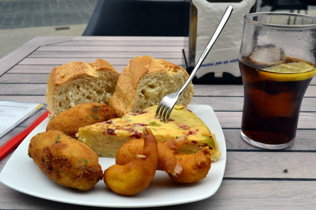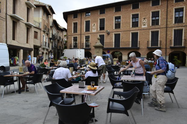 11時35分、雨が少し落ちてきた。たいしたことはない。すぐにやんで、曇ったり薄日がさしたりの天気。 12時過ぎにはロス・アルコスの町に到着。そのまま町を突っ切り、橋を渡って公営アルベルゲに。この時間だと4、5番目の着順になる。が、残念ながらベッドは自由に選べず、番号を指定された。 部屋に行ってみると、昨日と同じく上段。早く着いたからといって、必ずいい場所がもらえるわけではない。アルベルゲそれぞれに方針があるから、文句は言えない。 宿泊料8ユーロ=800円なり。その金額で、安心して眠れるベッドと汗を流すシャワーが提供されれば、ただただ感謝するのみ。文句を言ってはバチがあたる。 下段のベッドは2日前にペルドン峠で会った韓国の若い女性だった。このところ彼女とは前後して歩いている。歩くペースが同じだと、こういうことは珍しくない。初日のテント泊で隣だった黒人のおばさんとは、あちこちで顔を合わせているほどだ。 シャワーで汗を流し、町の中心にあるサンタ・マリア広場のバルで遅めの昼食。絵葉書を売っていたので、食べながら近況をしたためる。