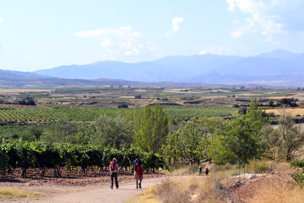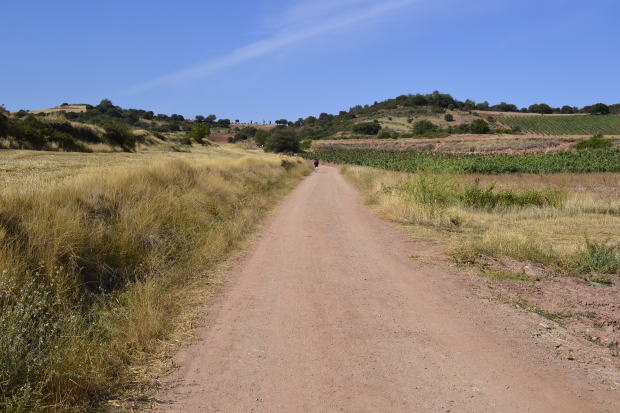 予定を変更して、今日はここまでにしようと思ったベントサには、12時少し前に着いた。巡礼路沿いに店を構えるバルでゆっくりと昼食。終わったらアルベルゲへ直行だ。 1時間以上も休んでおなかもいっぱいになった。すると、なんだか元気が出てきた。 昼食が終わった仲間が三々五々出発していく。それを見送っているうちに、わたしだけ弱音を吐いていいのか、という気持ちになってくる。 よし、いっちょう、やってやるか! というわけで、気持ちを切り替え、当初の予定どおりのナヘラへの道を歩く。 だらだらと、どこまでも続く小砂利の道。けっこうきつい。が、やめておけばよかったなんて思うなよ。そう思うとますますきつくなる。