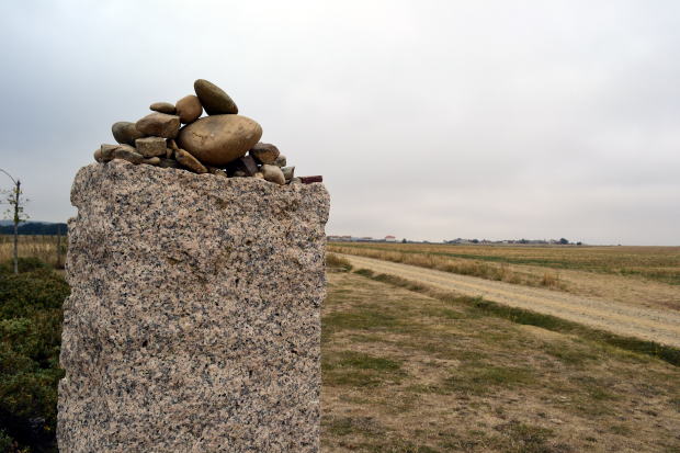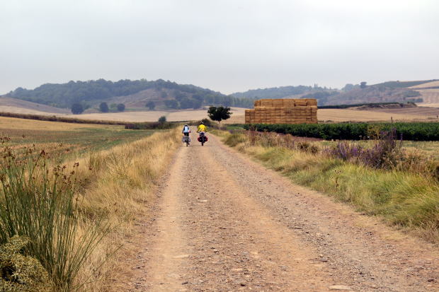 大聖堂でしばしの憩い 【13日目◆12年9月21日(金)◆曇りのち晴れ一時小雨◆Najera➔Sant Domingo de la Calzada◆21km/累計213.5km】 いつもより遅く、6時55分出発。風が生あったかい。半袖で十分だった。 昨日が29キロ、その前が28kmと、ややオーバーペースで疲れ気味。歩きだしてすぐに女性に追い抜かれる。さっそうと歩いているなあ。あの脚の長さでは一歩の距離が違いすぎる。抜かれるのは当たり前だ。 力強い女性が多い。ま、こんな旅に出ようというのだから、男勝りの気性じゃないとつとまらないのかもしれない。 8時。夜は明けたが、空一面、黒い雲。ふり返った東の空に、ほんの少し紅色が見える。さらに30分歩いて、アソフラの村に着いた。ガイドブックによると、ここは『星の巡礼』(パウロ・コエーリョ著)に登場する泉のある村だという。