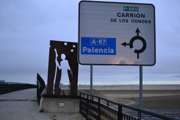 ▼出発地まで戻り、そこから15分ほど歩いたところに大きな道路標識があった。目的地のカリオンはまっすぐ。本当なら1時間前にここを通過していたのに。そう思うと霧雨がよけい冷たい。