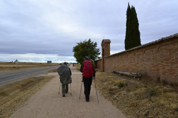 雨はやんだが右手から吹く風が強い。右、すなわち北だ。冷たいのも道理。その風の中をひたすら歩く。道は、左に2車線の舗装道路、右側が砂利の巡礼路。どこまで行っても同じだ。