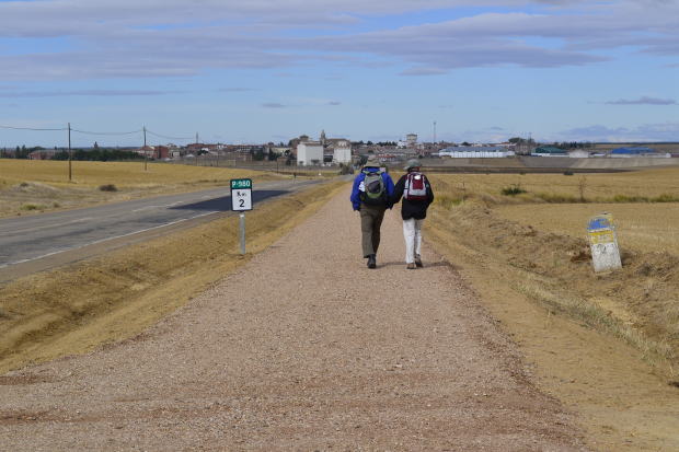 ▼手をつないで歩く二人。こういう巡礼もいいなあ。遠くに見えるのはカリオンの町だ。