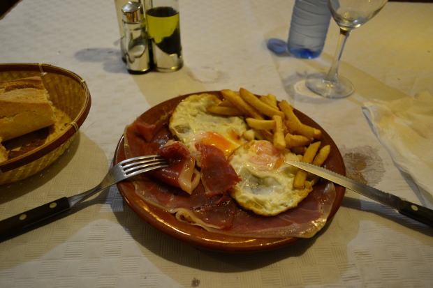 7時50分、レストランで夕食。初めて巡礼者用の定食を食べた。前菜、主菜、デザートのそれぞれに5、6種類の料理があり、一品ずつ選ぶ。おなかいっぱいにはならないが、まあまあというところか。11ユーロ。