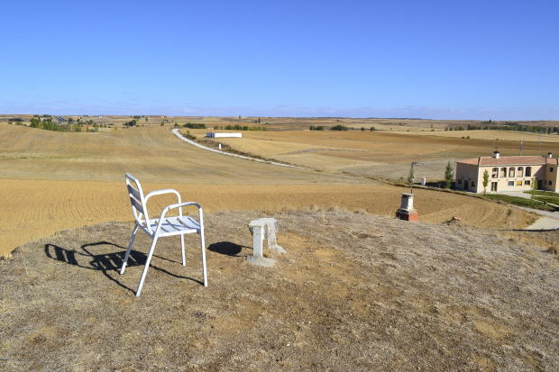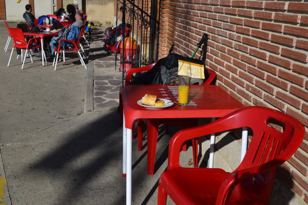 歩き続けるにつれ、リュックの重みで体が前かがみになり、まわりを見る余裕なんかなくなってくる。地面を見ながら歩くのみだ。こんなときは「般若心経」を唱える。266文字の短い経文のテンポが、ゆっくり目の歩調にピッタリ合うのだ。 般若心経を唱えている間に坂の下に小さな村が出現した。カルサディージャ・デ・ラ・クエッサだ。あそこで休憩しよう。