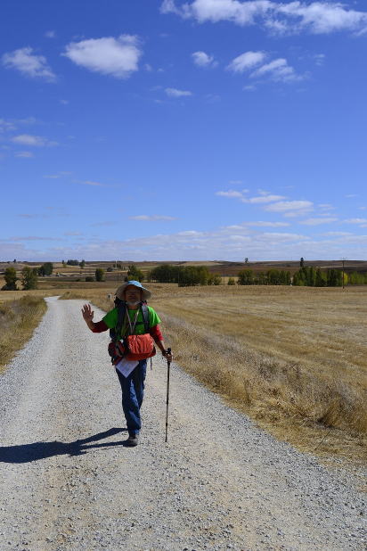 さて、そろそろだぞ。 今、30分たった。 400km地点通過! とセルフジャッジする。 距離標があるわけではないし、こればっかりは言った者勝ちだ。 時に2012年9月30日、1時34分。歩きはじめて20日目で旅の半分を踏破した。 感無量と言いたいところだが、それほどでもない。文字どおり、通過点だから。 とはいえ、記念日ではあるな。いいタイミングでやってきた巡礼仲間にシャッターを押してもらう。 ここが旅の半分の地点だと言うと、彼は、普通の写真じゃダメだ、向こうから歩いてこい、と演出する。で、400km地点を通過したときにシャッターを押してやると。 いい人が写真を撮ってくれた。おかげで胸を張って400km地点通過の写真と言える。 2時前にはモラティノス着。村はずれにアルベルゲを見つけてチェックインする。いちばん乗りだった。ベッドは自由に、と言うので、いちばんいい場所を確保。