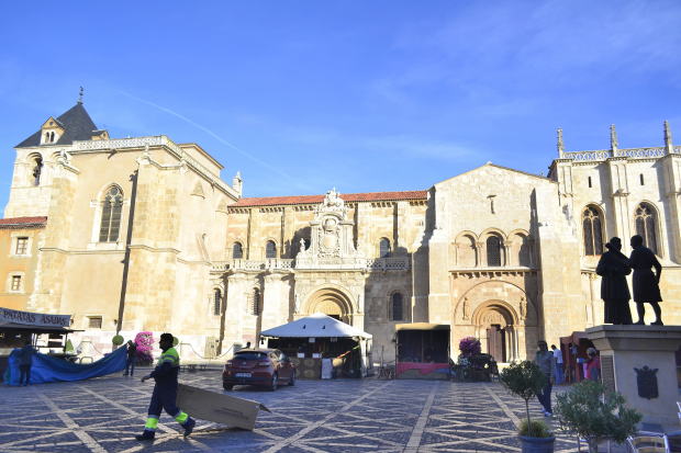▼サン・イシドロ教会。広場では朝市が開かれるのだろうか、その準備をやっていた。