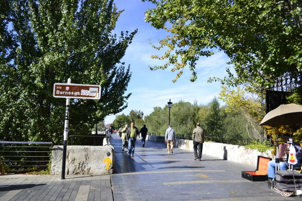 ベルネスガ川沿いに数分歩き、別の橋を渡って、パラドールのあるサン・マルコス広場へ戻った。広場の木陰にはベンチがいくつもある。今、座っているのは全員お年寄り。こうやっておしゃべりするのが日課なんだろう。