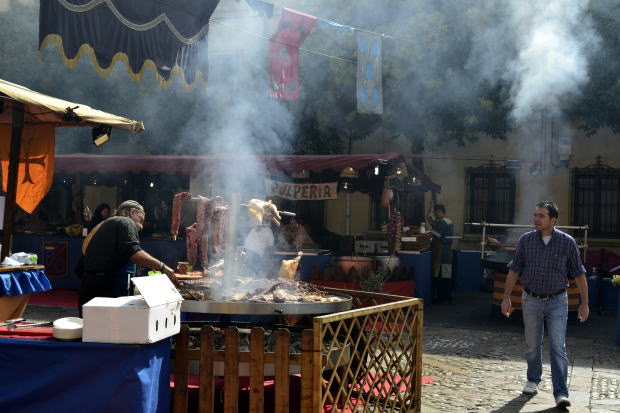 ▼肉を焼く煙がもうもうと立つサン・イシドロ広場の屋台。