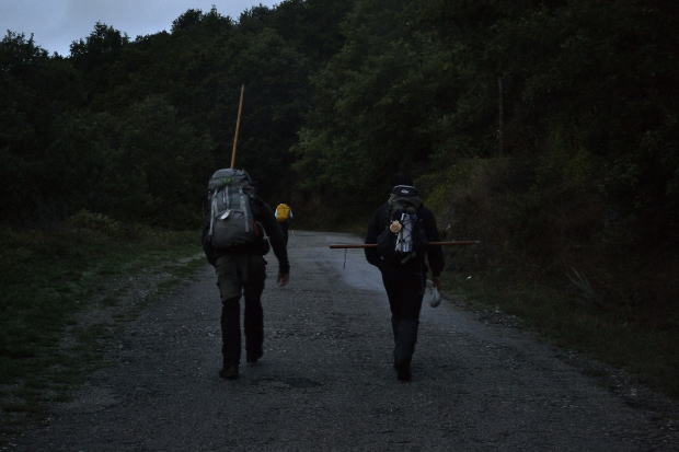 ▼歩きはじめて1時間ちょい、夜が明けはじめ、道は山に分け入っていく。上りがきつくなる。