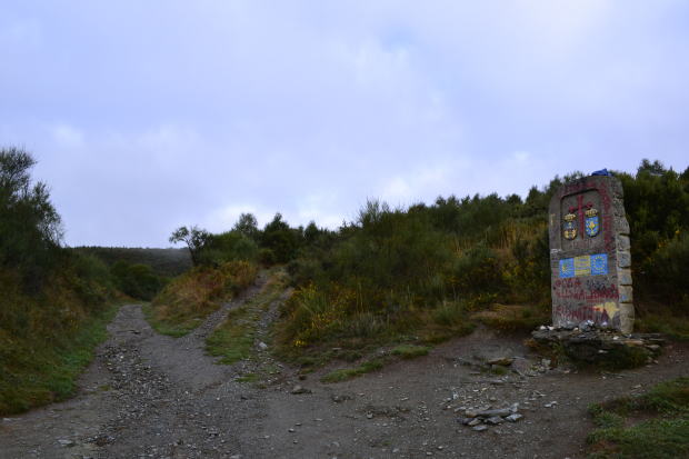 ▼落書きだらけの石碑をよく見たら、州境の標識だった。ここからガリシア州になるということだ。