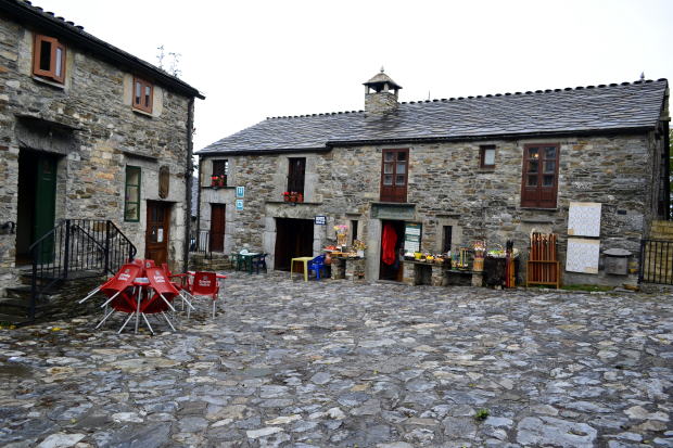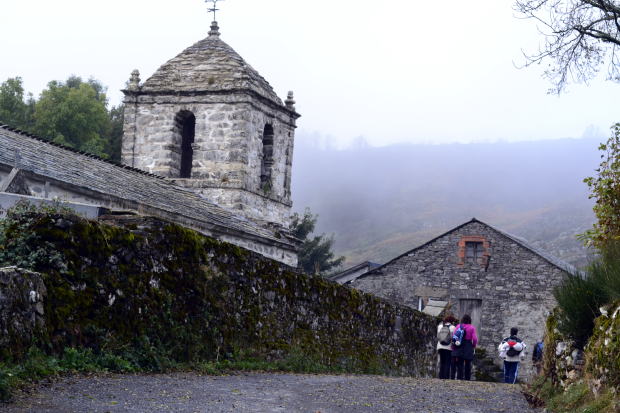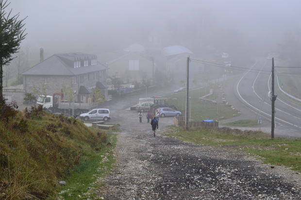 のんびり30分ほど歩くと、霧の中に建物が見えてきた。オ・セブレイロ村の中心だな。