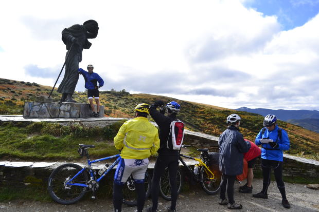 ▼帽子を押さえて歩く巡礼者像。自転車巡礼の一団が写真を撮っていた。