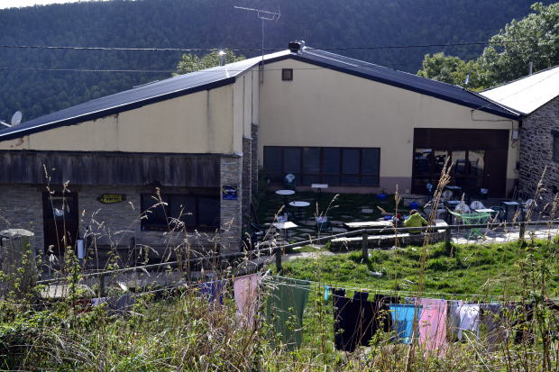 ▼フォンフリア村のアルベルゲ。道路をへだてた草地に洗濯物の干場がある。