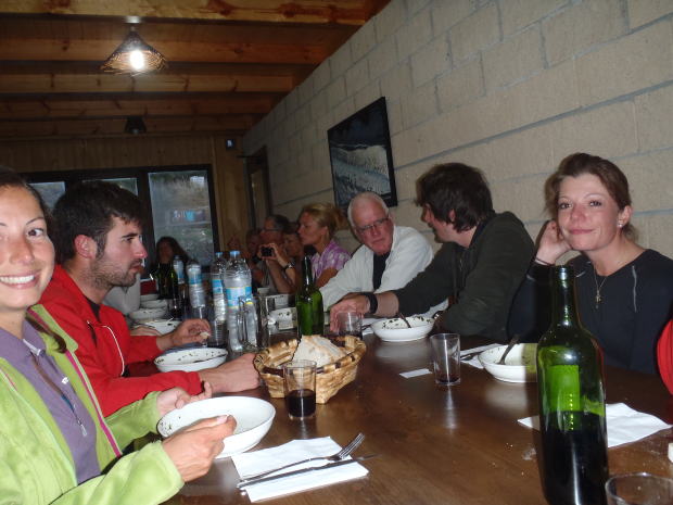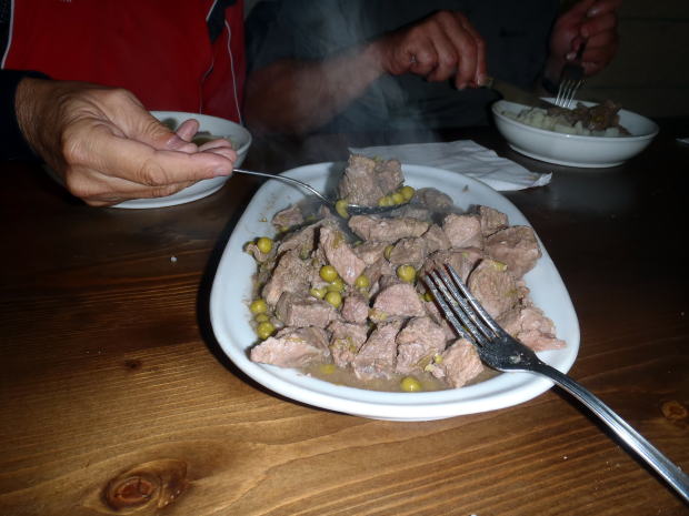 ▼夕食はアルベルゲの食堂で。老いも若きも盛り上がって、とてもにぎやかな夕食だった。