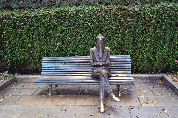 並木道の大聖堂がよく見えるところにベンチがあり、微動だにせず座っている人がいる。さっきのマネキンおばさんと同じく、こちらはメガネをかけたいかめしい男性のオブジェだ。