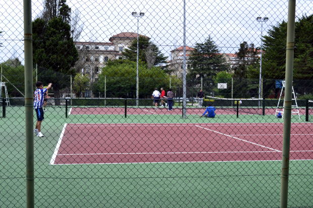 ぶらぶらと公園を半周したところでテニスコートを発見。公園のすぐそばだ。人がいるのでいってみた。2コートあるうちひとつは初心者クラス、もうひとつはジュニアのクラスだった。