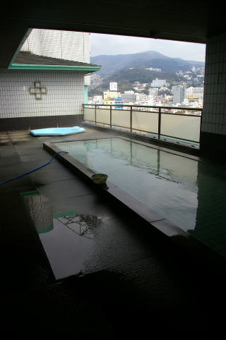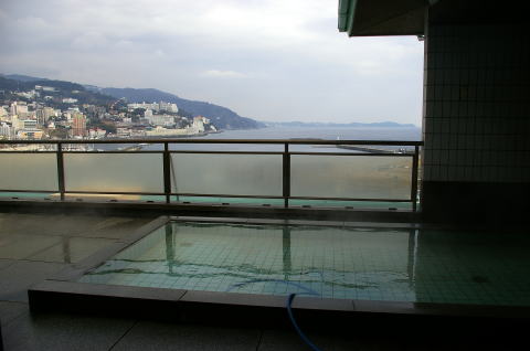 露天風呂はホテルの最上階にありました。熱海港が真下に見え、左手には熱海の街が広がっています。お湯につかっていると潮風が心地よく吹きぬけていきます。お湯もちょっと塩辛く、海辺の温泉ですね。泉質は塩化物泉。
