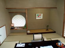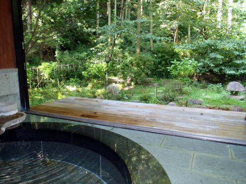 貸切露天風呂の山水にも入りました。浴槽は円形。ぬるめのお湯でいつまでも入っていられます。広い濡れ縁があり、その先は庭園。午後のやわらかな日差しが木漏れ日となって揺れ、おだやかな気持になれる空間でした。