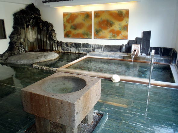 大浴場(上の写真)はやや小ぶり。戸を開けて一歩足を踏み入れると、緑色の床が目に飛び込んで気持ちを和ませます。ぬめぬめしていないのがgood。石材は何を使っているのでしょうか。お湯も上々。