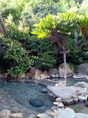 露天(右の写真)がまたいいですね。たっぷりの日差しを浴びて輝く木々、張りだした蘇鉄が南国伊豆の風情を演出しています。